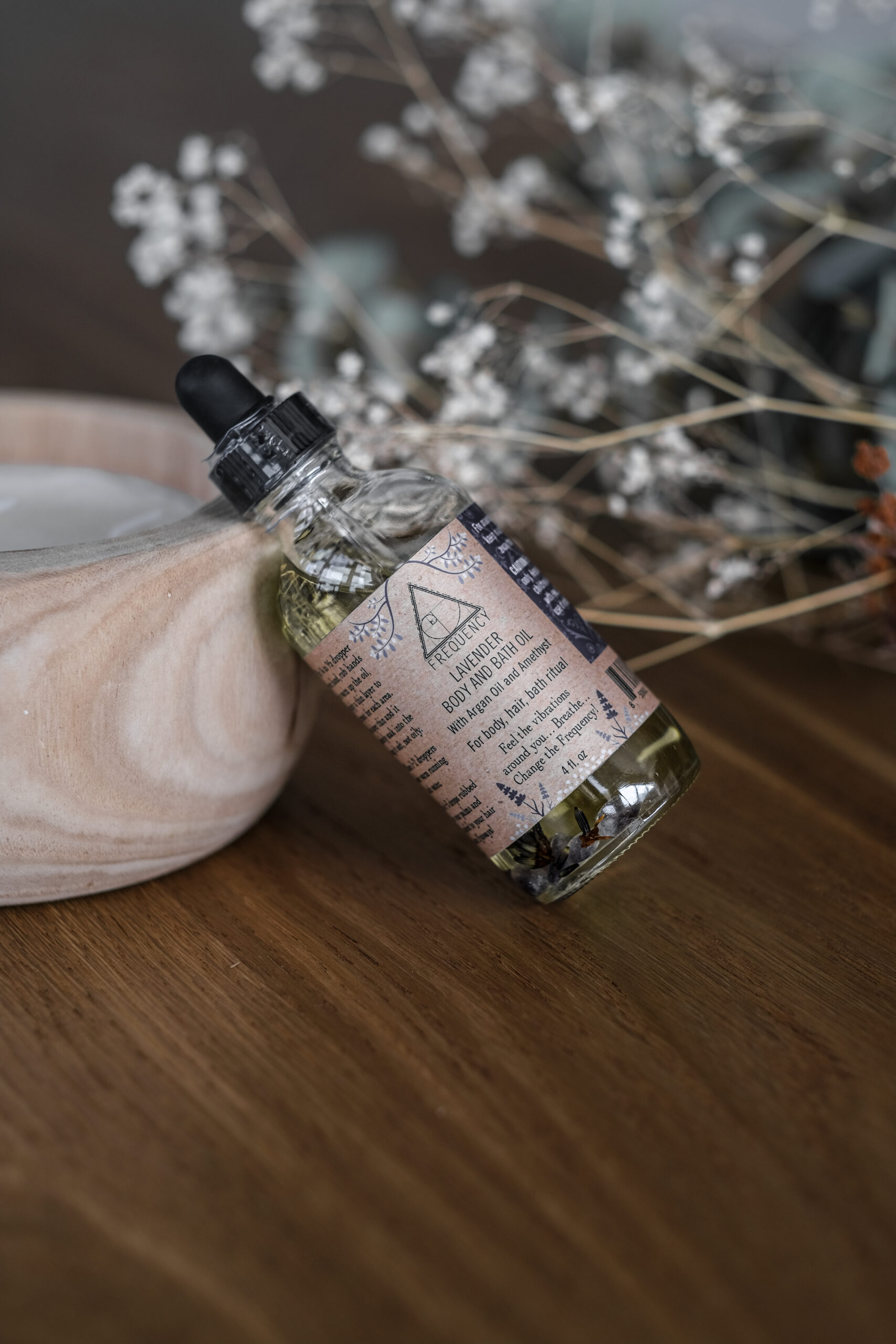 Presenting the Frequency Lavender Flowers Body and Bath Oil, a lavish fusion imbued with the enriching attributes of argan oil and the calming aura of Amethyst crystals. Elevate your personal care regimen with this opulent oil, meticulously crafted to elevate your body, hair, and bath ceremonies. With its versatility and captivating essence, it serves as the ideal partner for moments of serenity and revitalization, ready to be enjoyed whenever you seek tranquility.